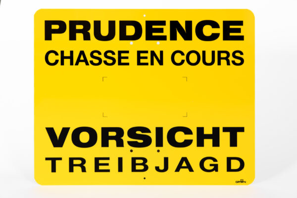 PLAQUE EN PVC “VK” 2 mmDIMENSIONS: 500 x 400 mm,couleur : jaune / noir “PRUDENCE CHASSE EN COURS”